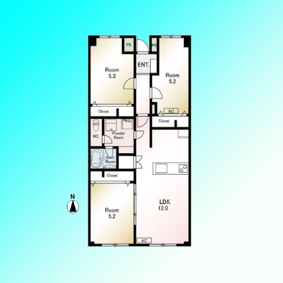 | 間取 | 3LDK (LDK12帖、洋室5.2帖、洋室5.2帖、洋室5.3帖) | ||