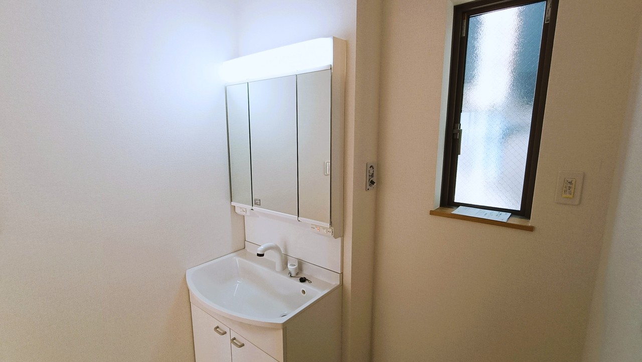 A号棟 三面鏡を採用した洗面化粧台。鏡の裏にも収納スペースがあります。