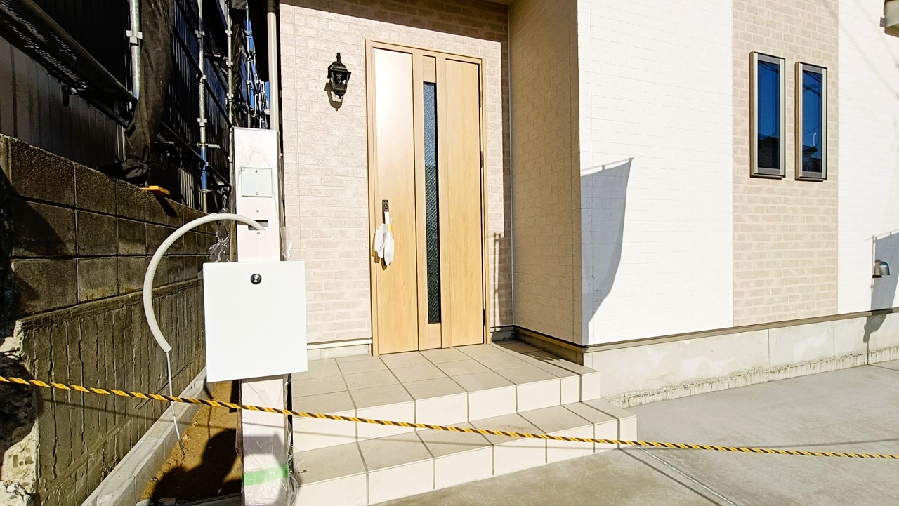 A号棟 ポーチのついた新築分譲物件。玄関の印象はいかがでしょうか?入口からご覧ください。