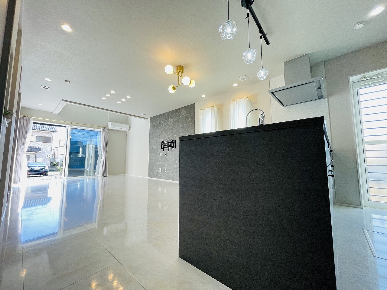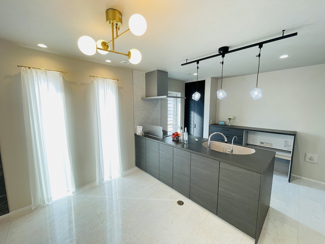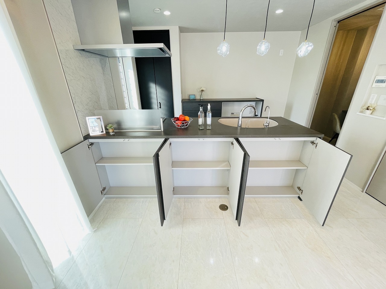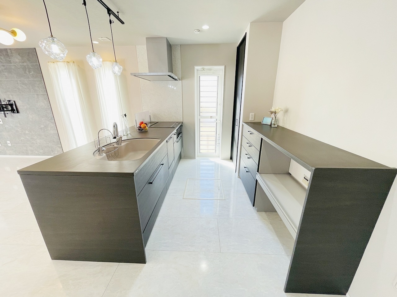 カウンターキッチンは、キッチン側とリビング側に分かれてお店間隔でのお食事も可能!! お休みの日には、いろいろな楽しみ方を家族みんなでお楽しみください
