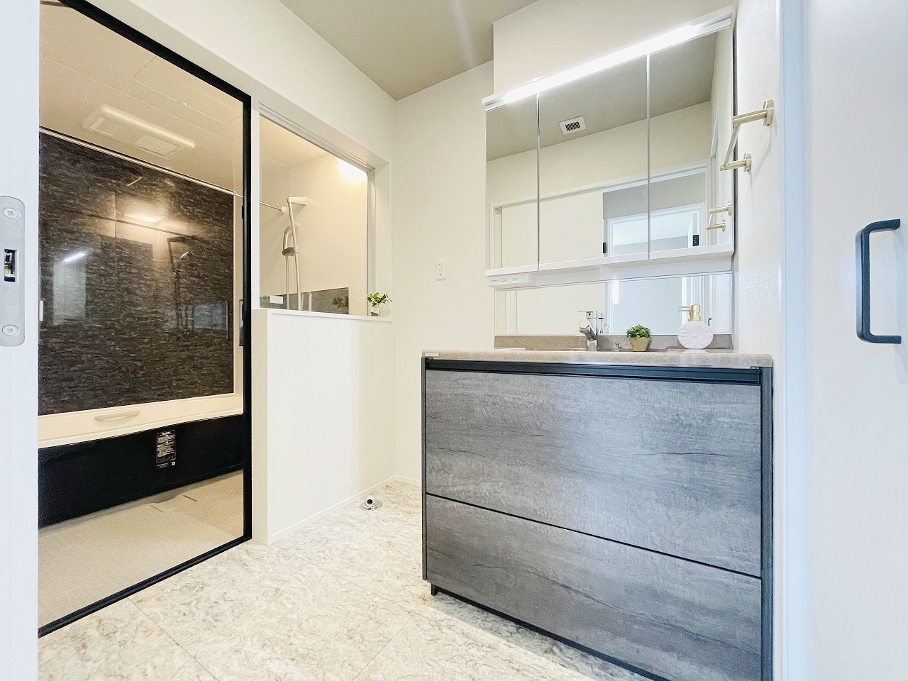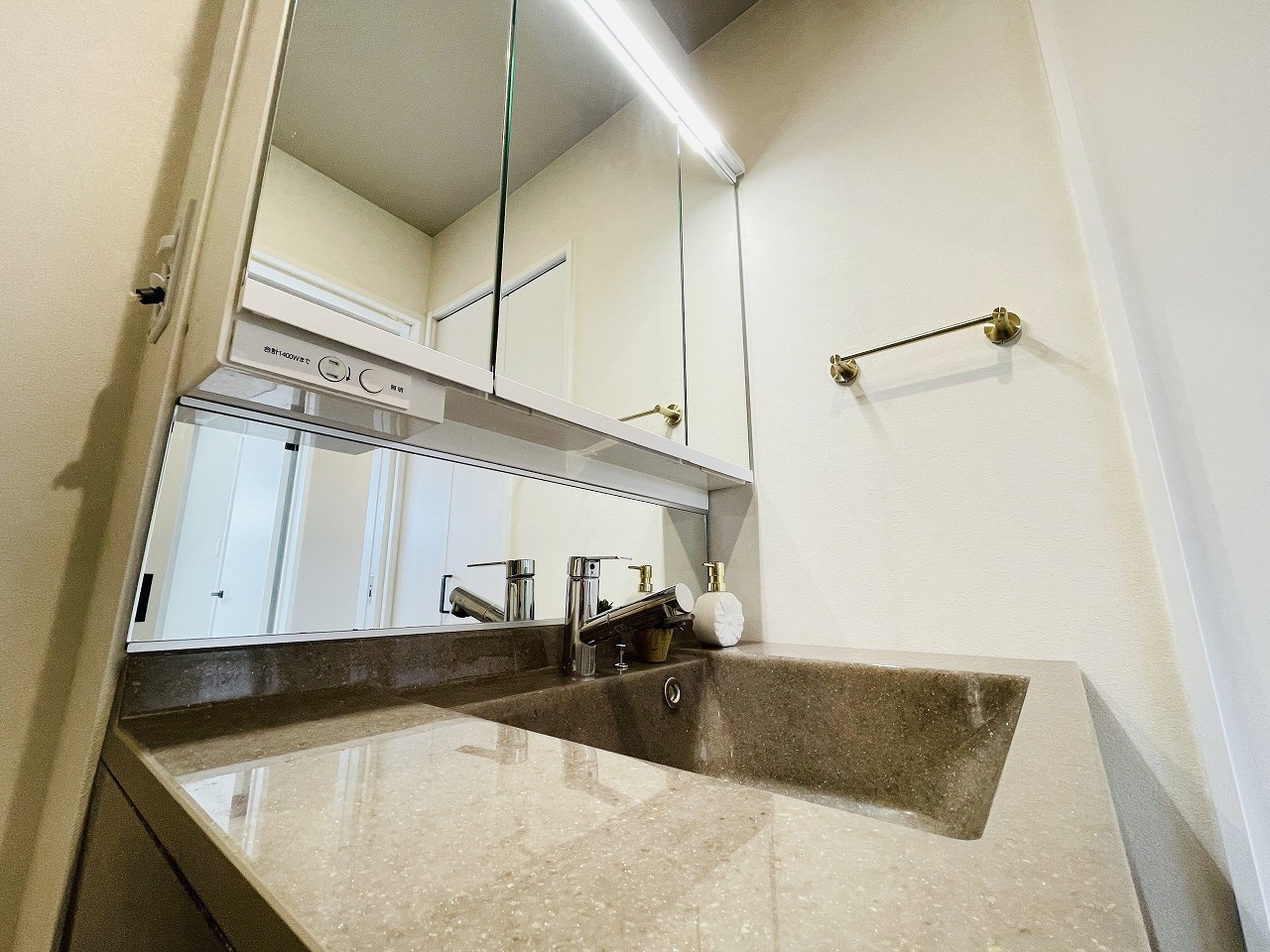 三面鏡に洗面台。 コンセントに照明機能、多機能性を備えた設備です。