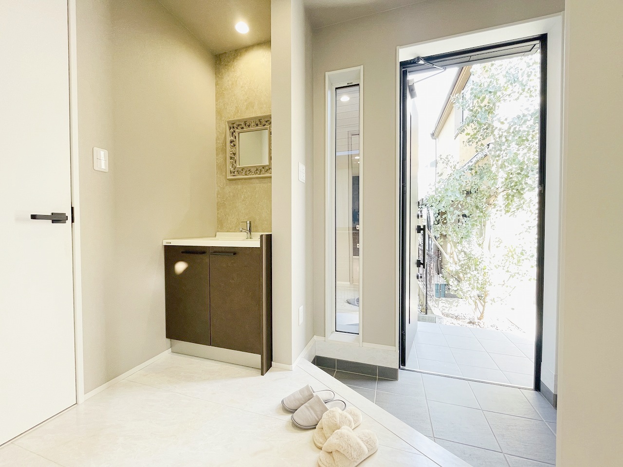 玄関は家の第一印象を左右する重要な場所。ほどよい広さとスタイリッシュな色遣いが印象的です。