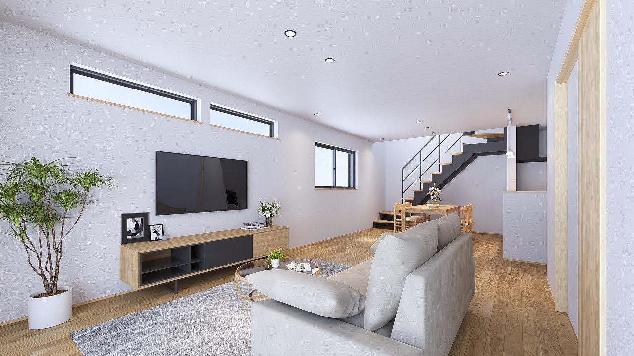 リビングの完成イメージパース。約22帖のリビング空間に2階へのストリップ階段が設置されておりより開放的なリビングに。