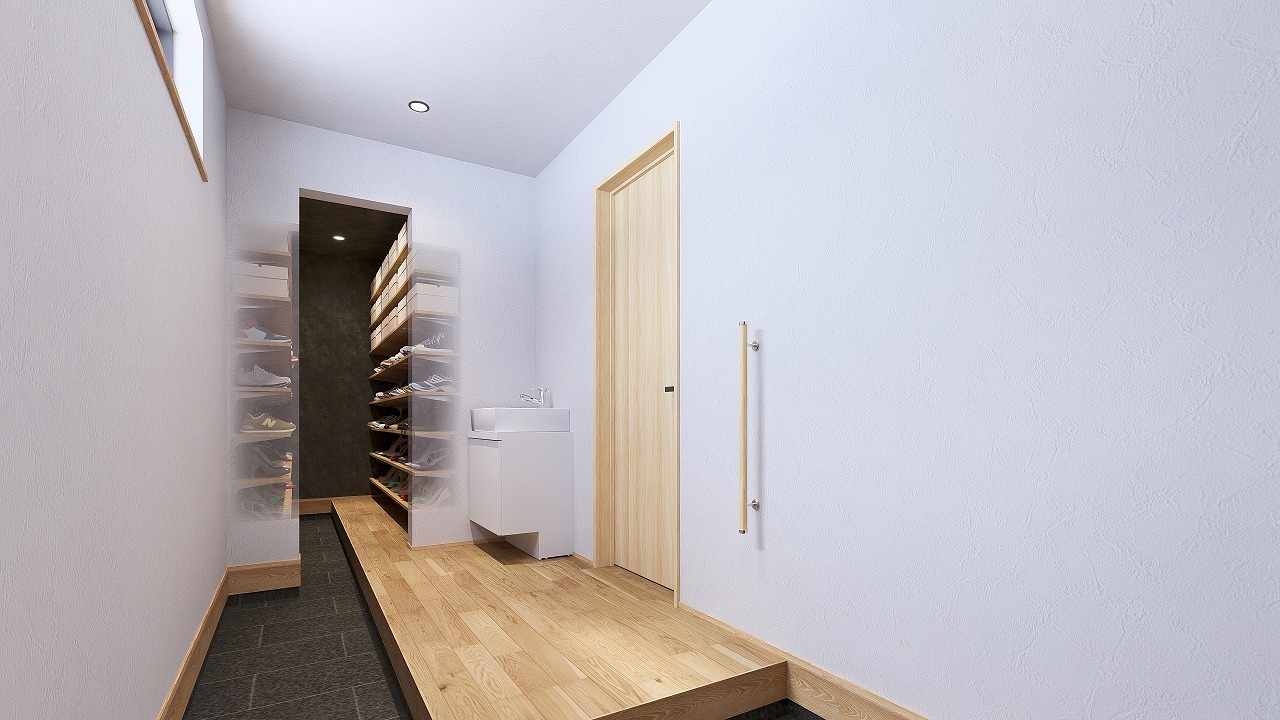 玄関のイメージパース。土間でつながるシューズクロークがあります。