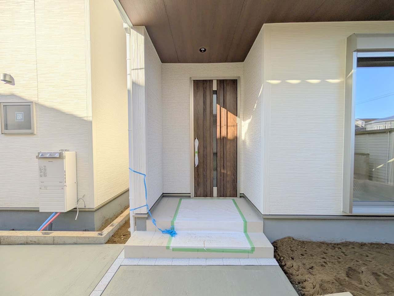 ポーチのついた新築分譲物件。玄関の印象はいかがでしょうか?入口からご覧ください。