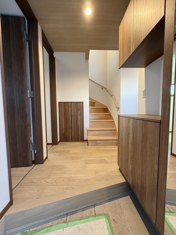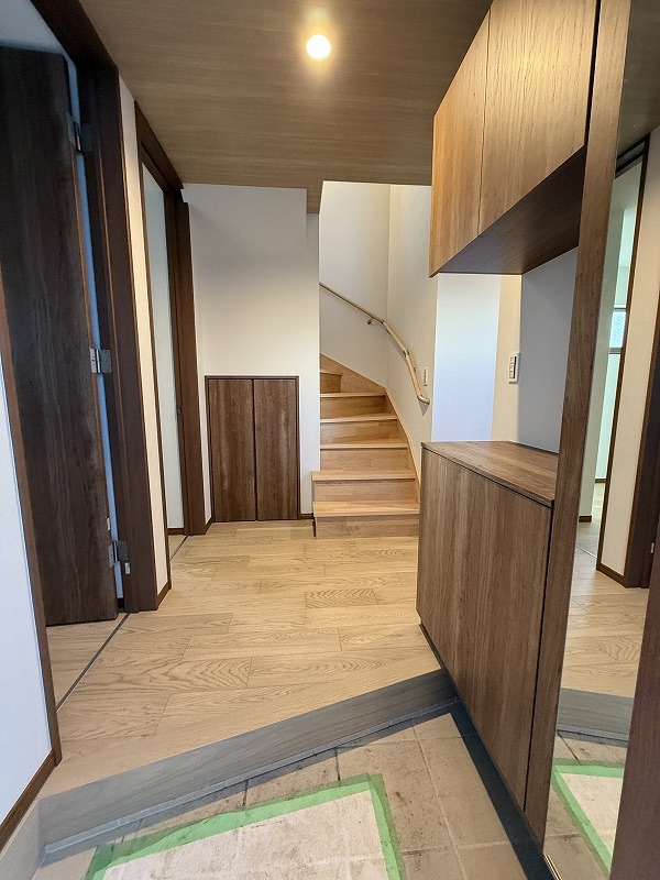 シックな色味で統一された玄関ホール室内。 コの字型の下足入れは、鍵や写真なども置ける使い勝手のいいタイプ
