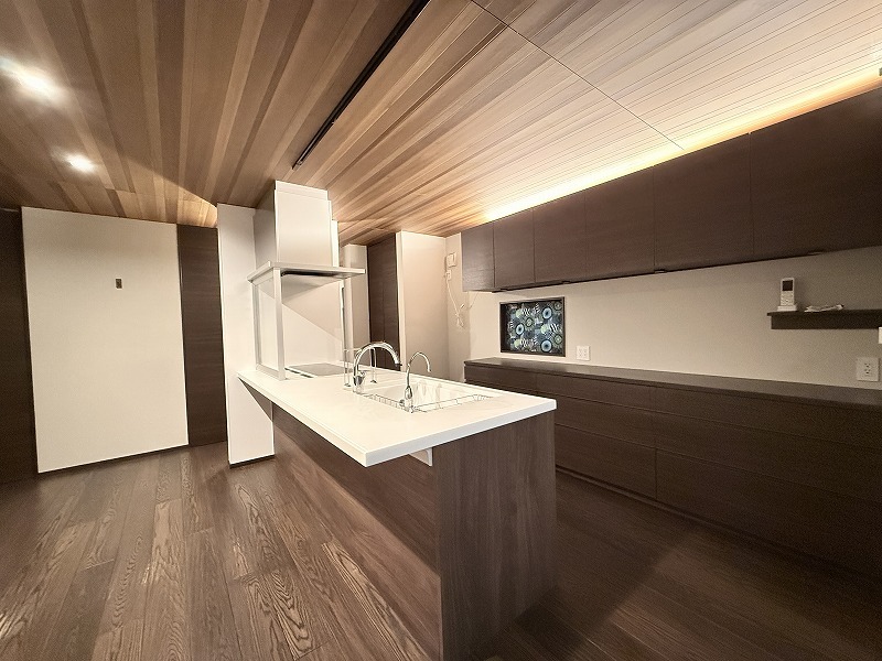 回遊性のあるアイランドキッチンを採用、間接照明も効果的に配置されたホテルライクな雰囲気