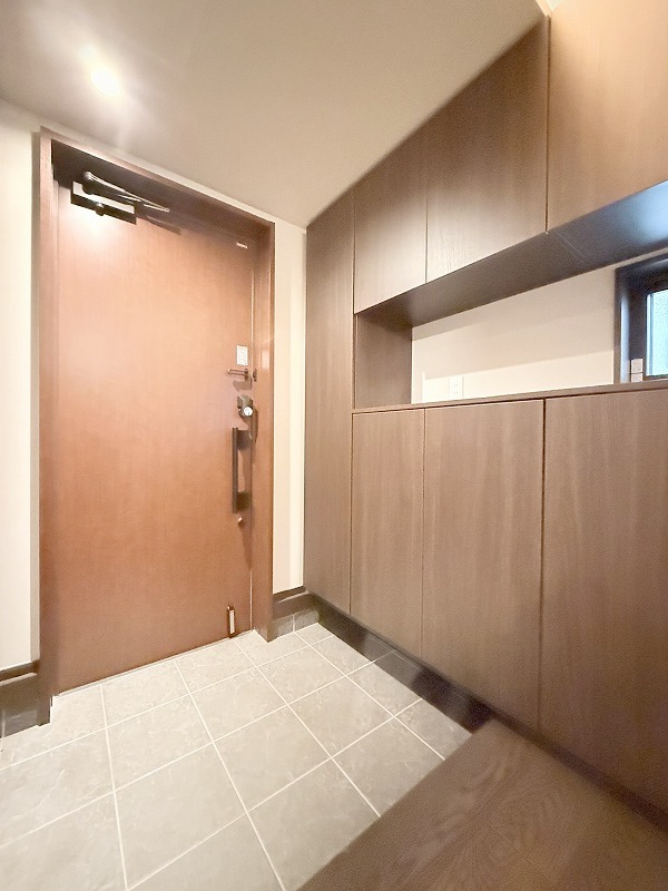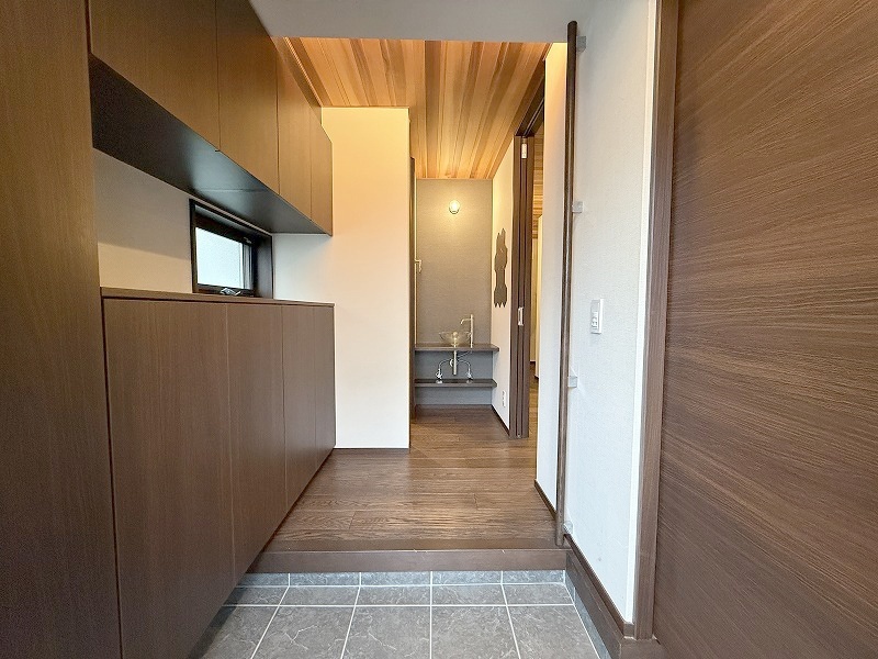 玄関は家の第一印象を左右する重要な場所。ほどよい広さとスタイリッシュな色遣いが印象的です。
