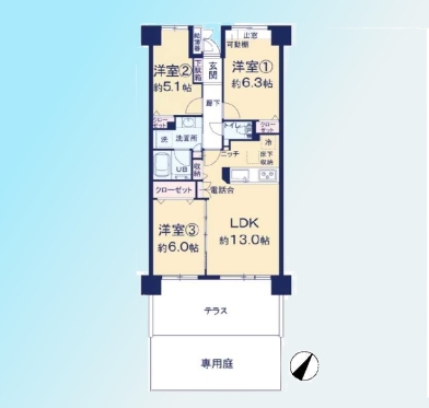 | 間取 | 3LDK (LDK13帖、洋室6.3帖、洋室5.1帖、洋室6帖) | ||