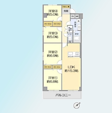 | 間取 | 4LDK (LDK15.3帖、洋室5帖、洋室5帖、洋室6.9帖、洋室6.8帖) | ||