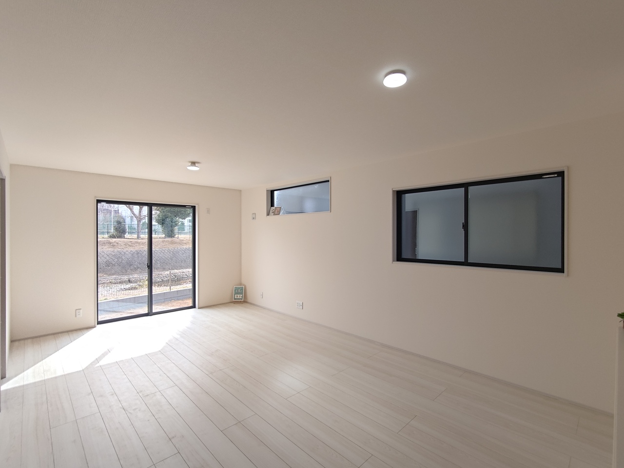 2号棟 家族や友人、両親、親戚とこれから沢山の時間を紡ぐのだろう。そこを彩るのは窓から見える青い空、心地よい緑。そんなイメージが膨らむリビングスペース。 2026/02/20m