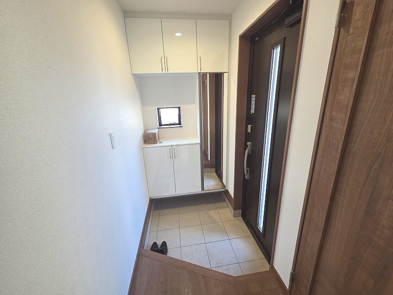 コンパクトながらも、使い勝手の良い玄関スペース。明るいデザインと、収納スペースを効果的に配置することで、使い勝手を最大限に引き出しています。