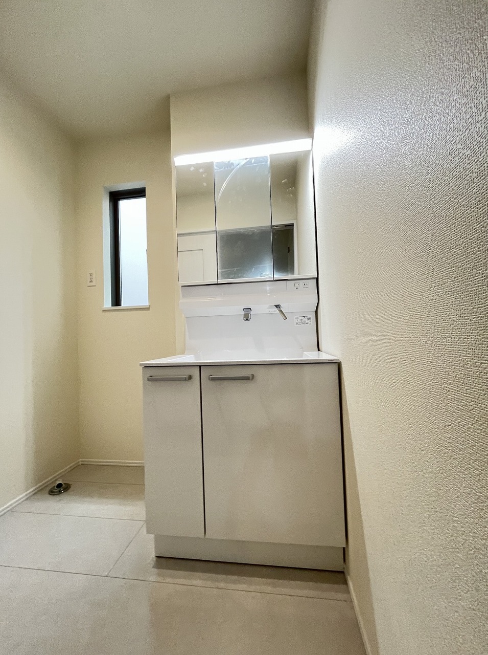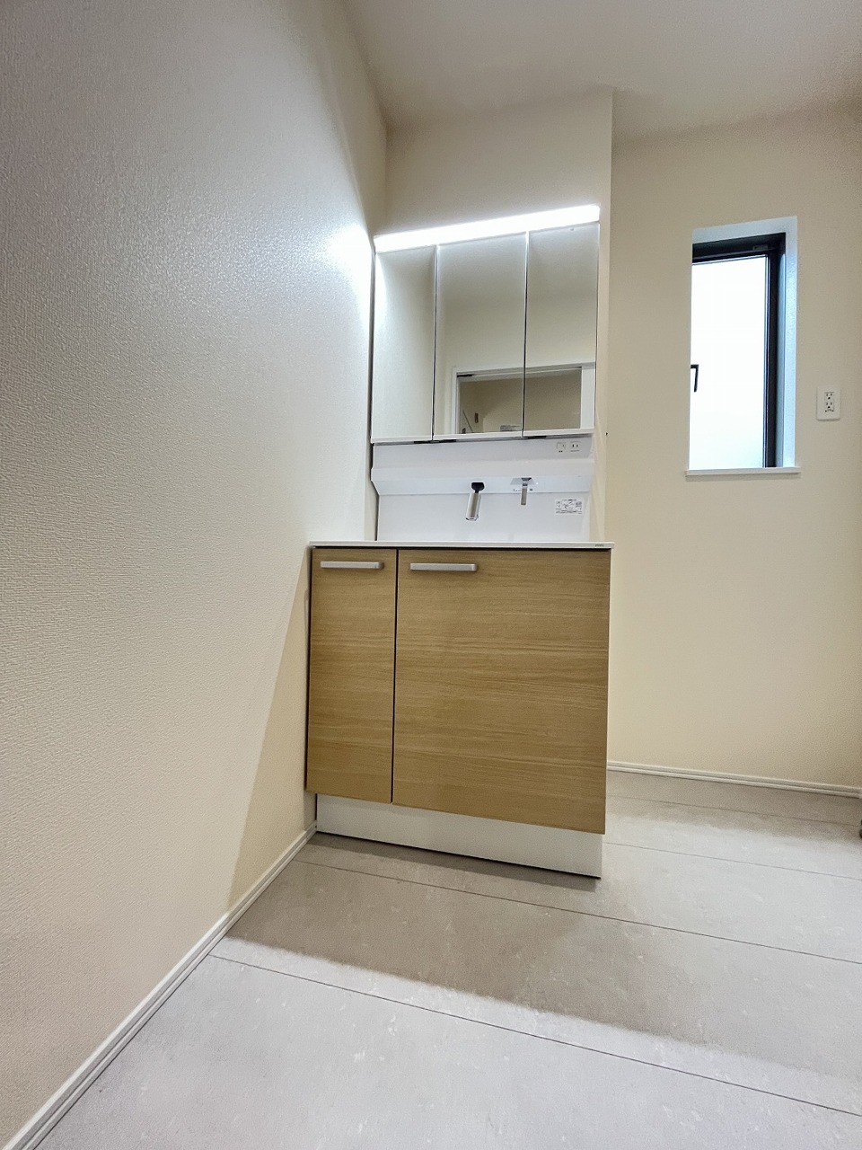 C号棟 収納豊富な三面鏡付洗面化粧台。水回りのあれこれがキレイに収まりそうですね。
