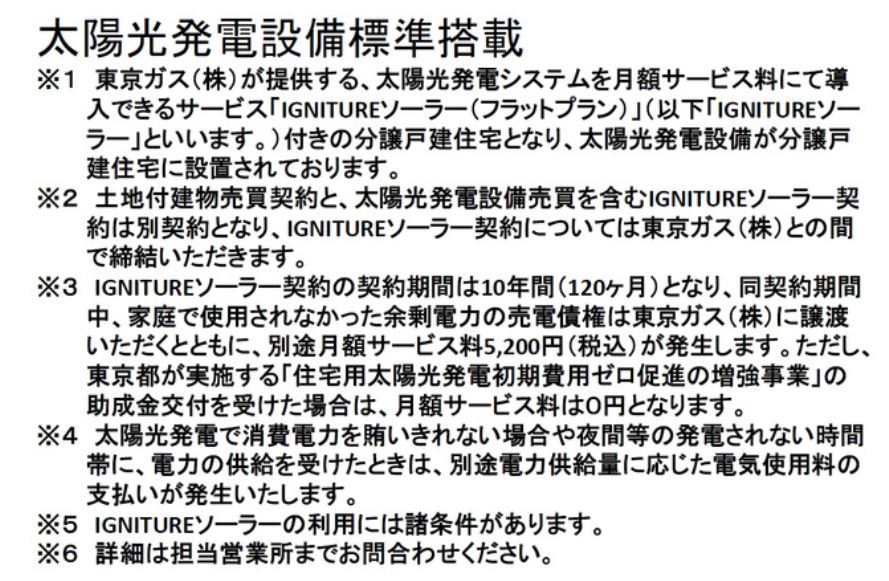 | 備考・制限等 | 準防火地域、第2種高度地区、密集市街地整備法,宅地造成工事規制区域、日影規制4h-2.5h-4m。太陽光発電設備は別途東京ガスとの間でサービス利用契約要(契約期間10年、月額利用料5200円、東京都助成金交付の場合は0円。別途諸条件有) | ||