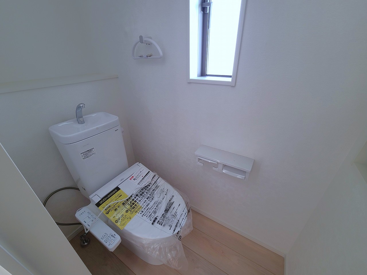 ウォシュレット機能付きのトイレ。換気のしやすい窓付きで、収納もあり実用性も兼ね備えた造り。