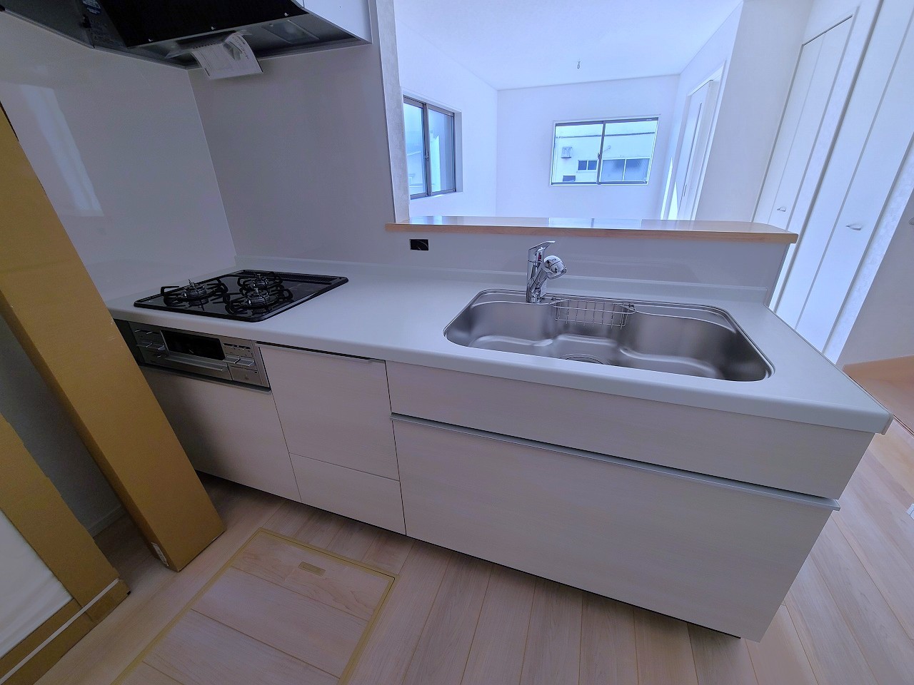 リビングにいる家族の顔が見渡せるカウンターキッチン。お料理もより一層おいしく、楽しく。食器棚を背面に設置しても十分な広さを確保しています。