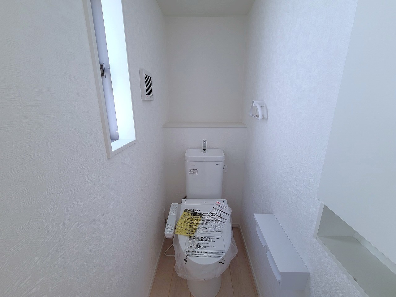 ウォシュレット機能付きのトイレ。換気のしやすい窓付きで、収納もあり実用性も兼ね備えた造り。