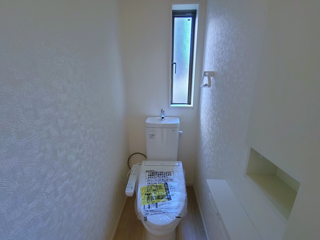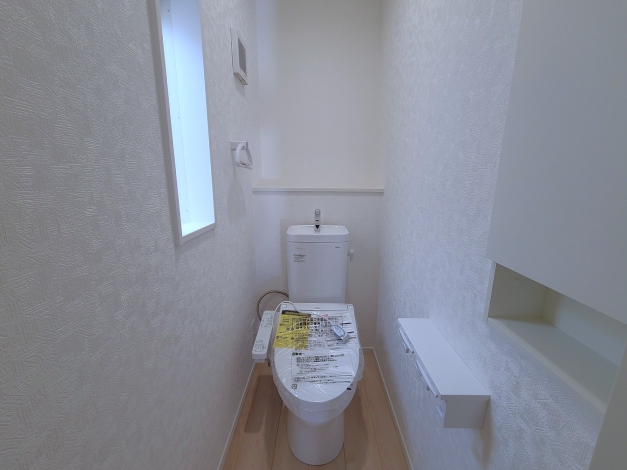 4号棟 ウォシュレット機能付きのトイレ。換気のしやすい窓付きで、収納もあり実用性も兼ね備えた造り。