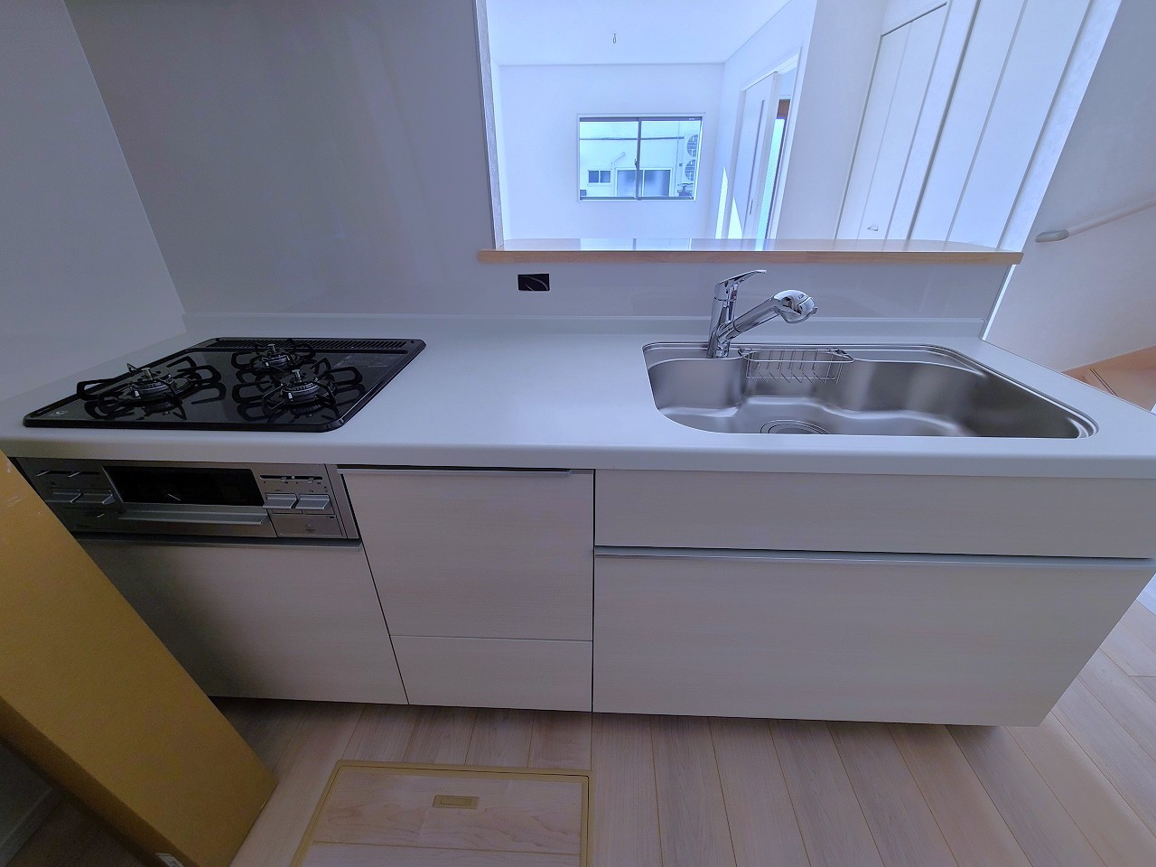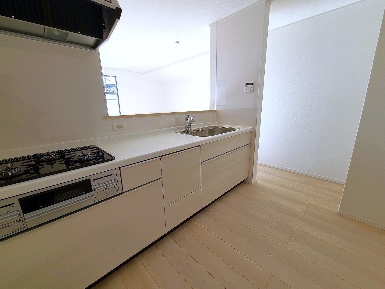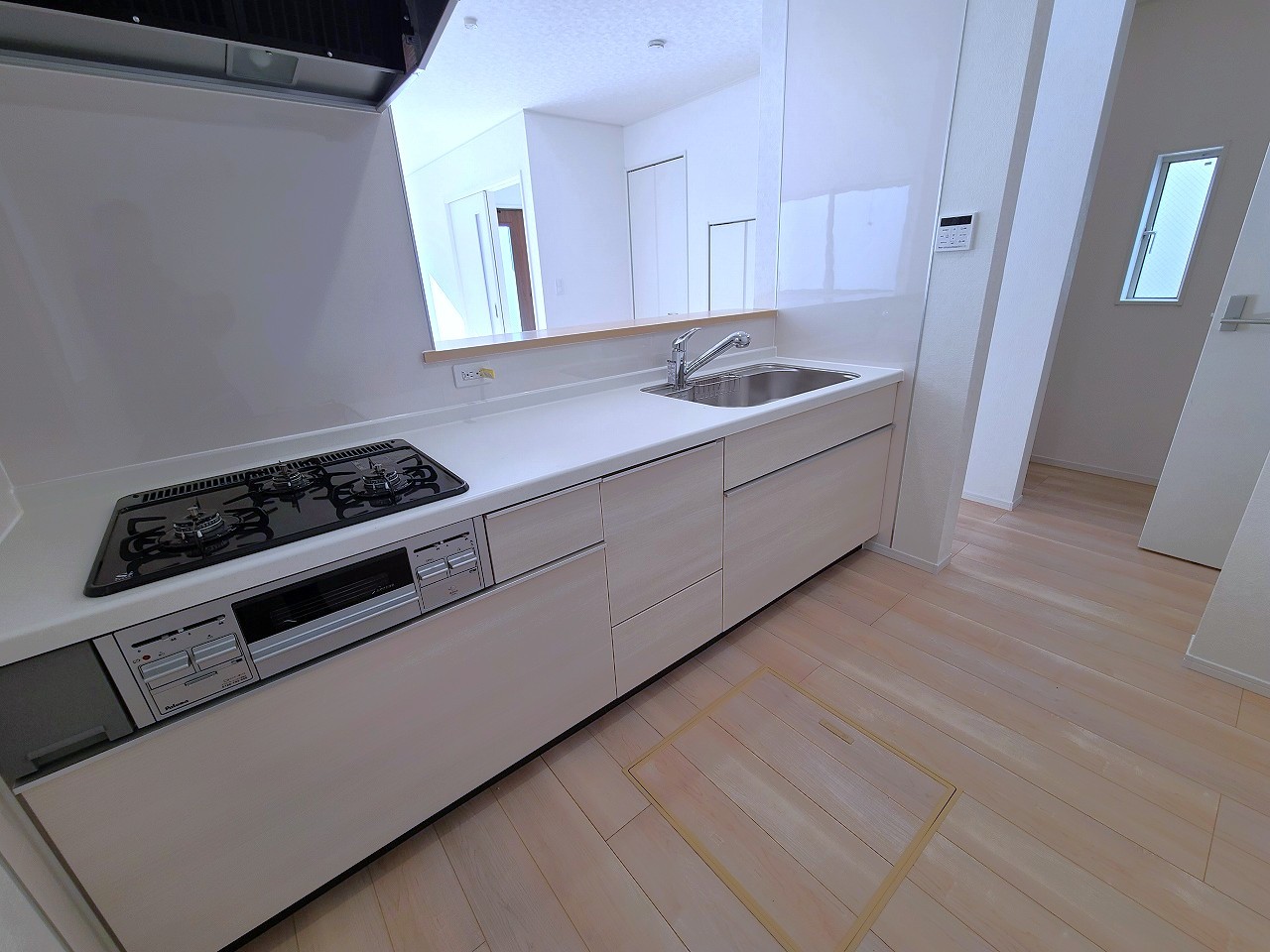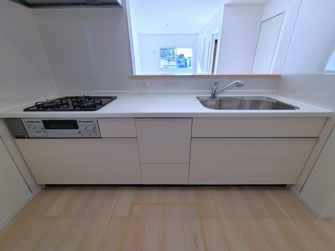 3号棟 リビングにいる家族の顔が見渡せるカウンターキッチン。お料理もより一層おいしく、楽しく。食器棚を背面に設置しても十分な広さを確保しています。