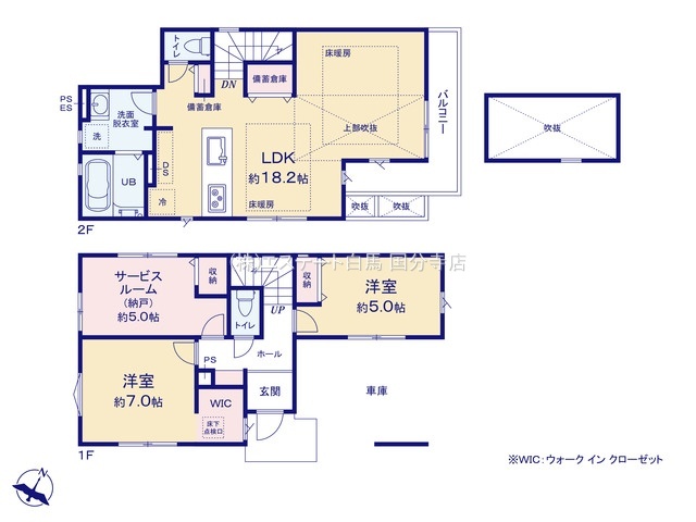 駅徒歩5分、2路線利用可。LDK18帖、食洗機、床暖房付。水廻り集中。リビング収納、吹抜けあり。全室2面採光。WICあり。ビルトインカレージ。
