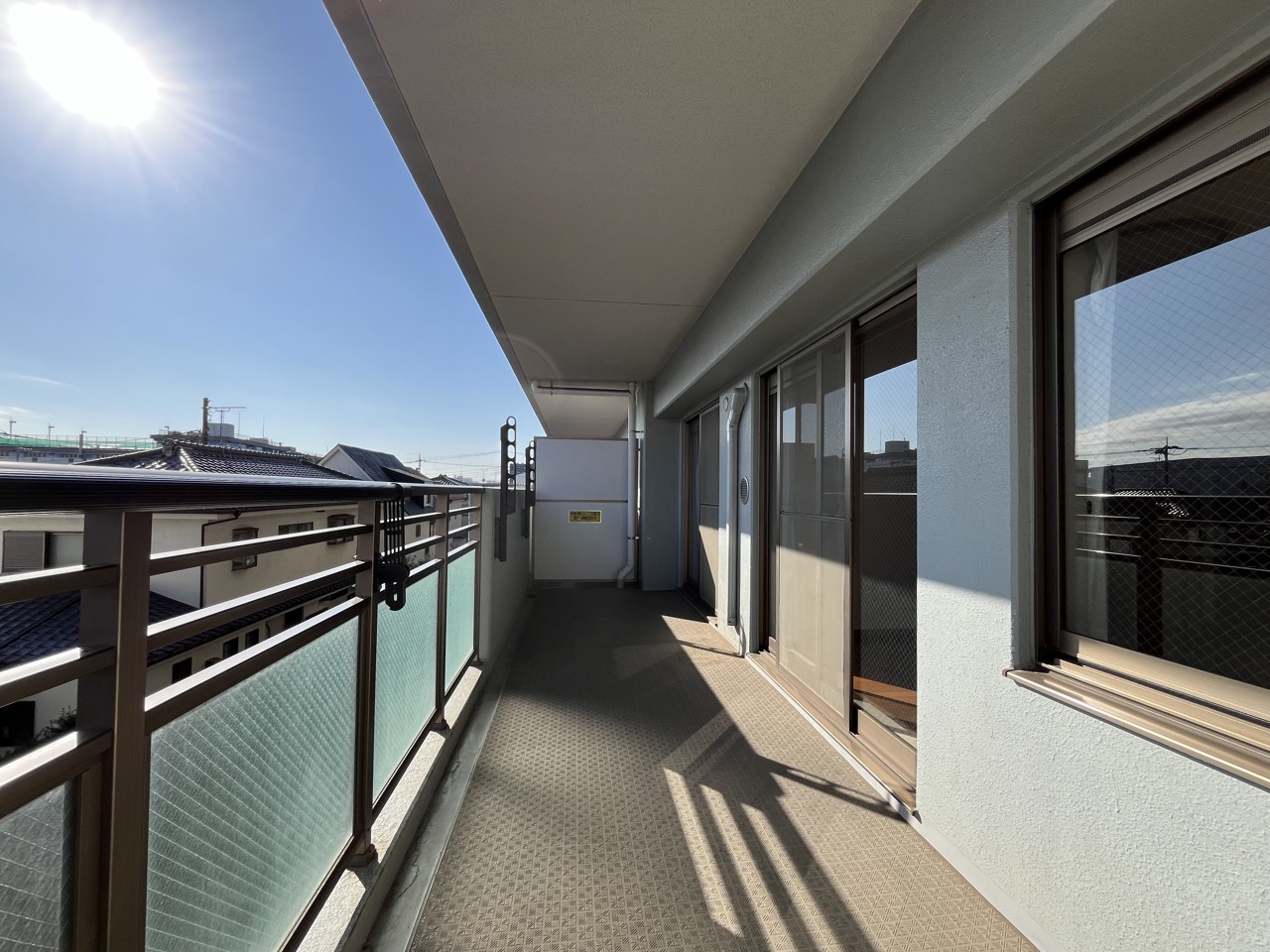 南側のお部屋から出入りできる、奥行きのあるワイドバルコニー。心地よい陽射しと暖かな風を楽しむことが出来ます。