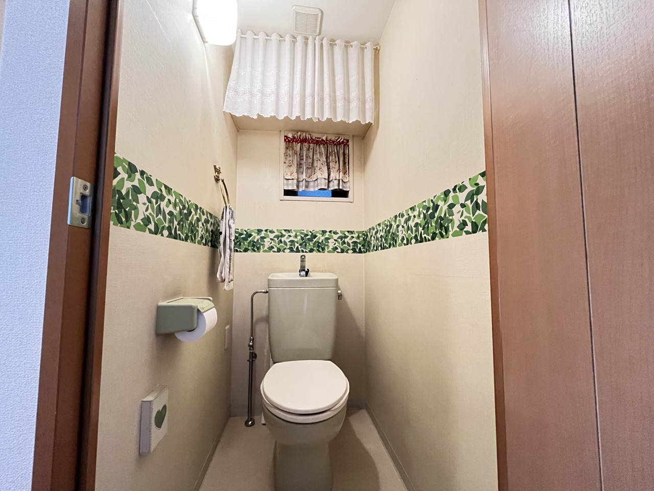 窓と上部に収納のあるトイレ。
