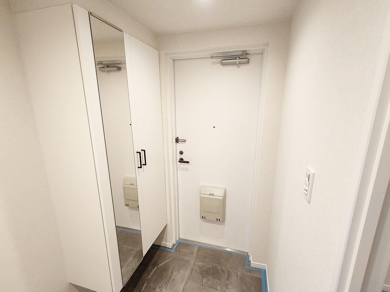 忙しい朝でもさっと身だしなみの確認が出来る大きな鏡付きシューズクローク