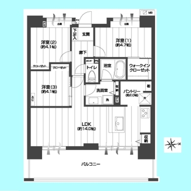 | 間取 | 3LDK (LDK14帖、洋室4.7帖、洋室4.1帖、洋室4.1帖) | ||