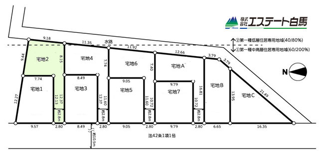 | 備考・制限等 | 準防火地域、高度地区、宅地造成及び特定盛土等規制法、重要土地等調査法、不整形地(2.4.6.A.C号棟)、東側水路(2.4.6.A.B.C号棟)、法22条区域、高さ制限10m、 | ||