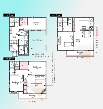| 間取 | 4LDK (洋室6.4帖、LDK19.4帖、洋室6.3帖、洋室4.4帖、洋室7.4帖) | ||