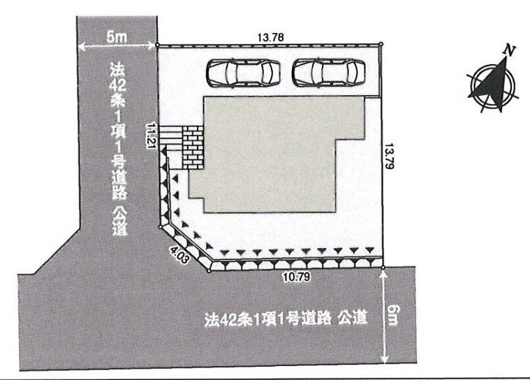 | 接道 | 西側5M公道に10.79M接道 南側6M公道に11.21M接道 |