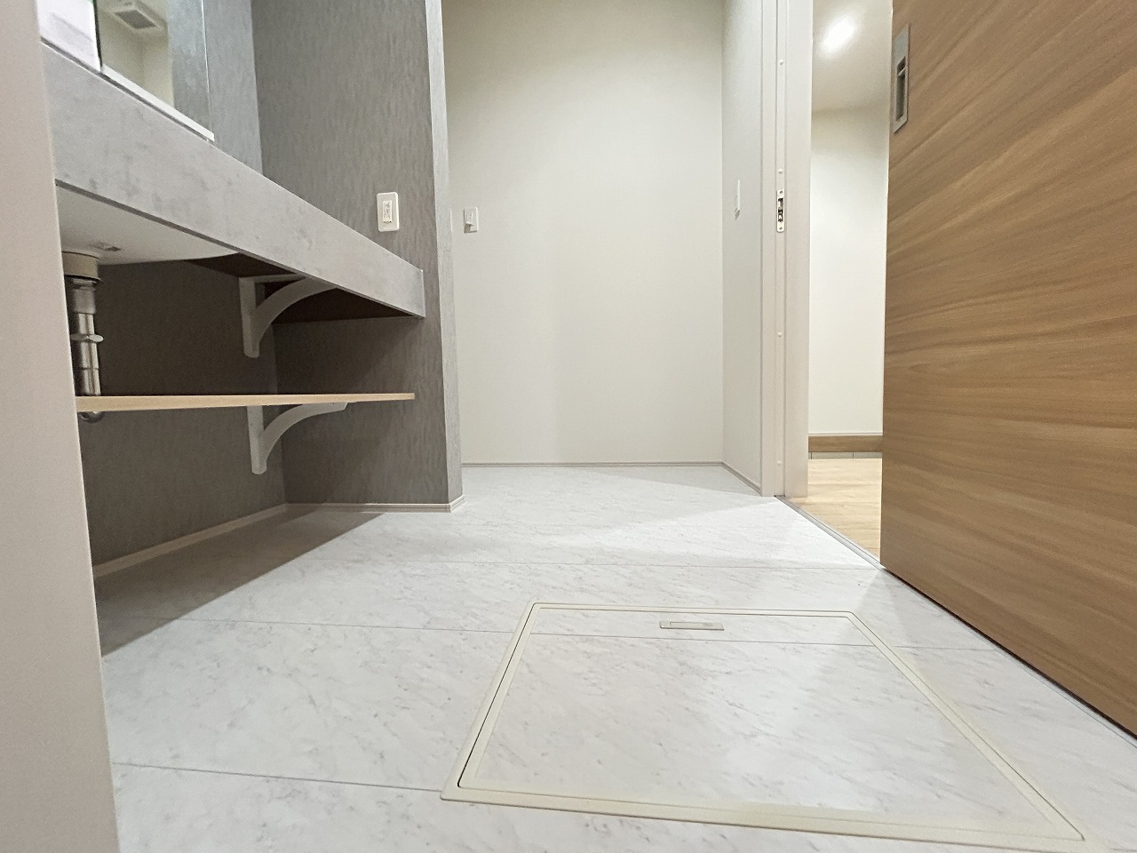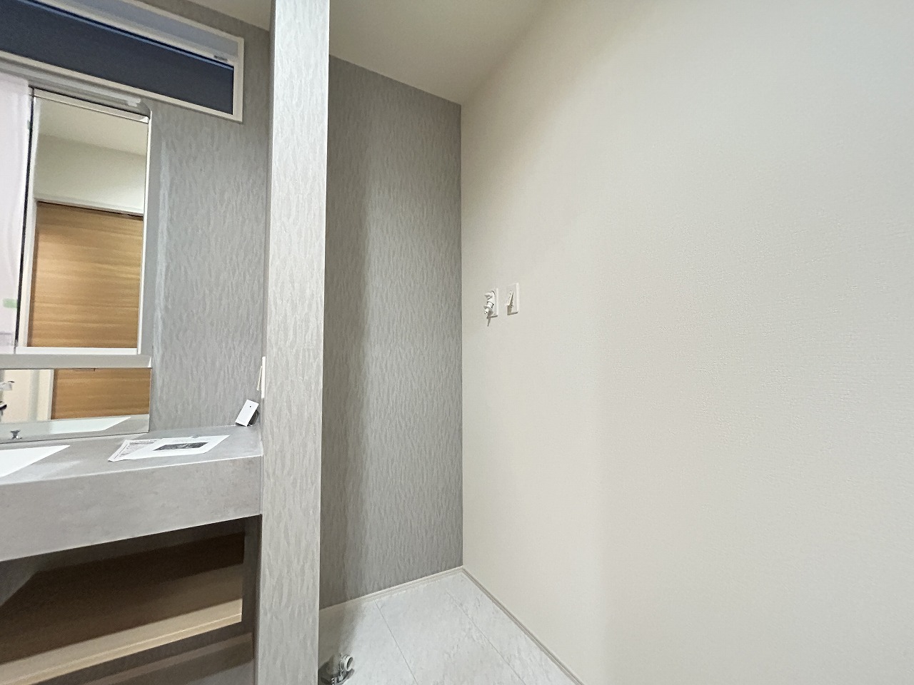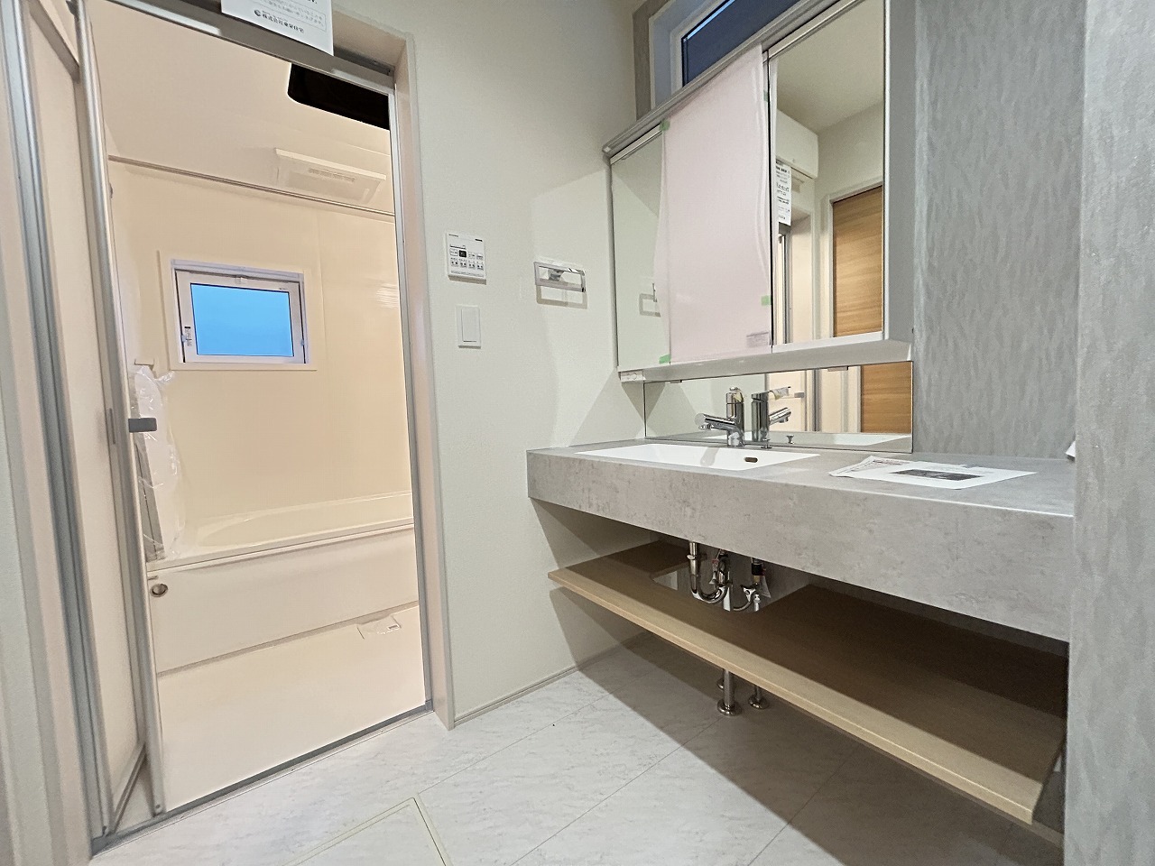 4号棟 収納豊富な三面鏡付洗面化粧台。水回りのあれこれがキレイに収まりそうですね。