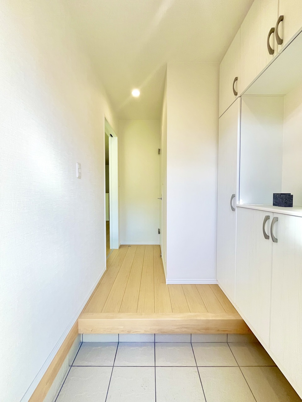 B号棟 お宅の顔となる明るく開放的な玄関。ご家族皆様様の靴を収納できるスペースと全身鏡があり、お出掛け前に身だしなみチェックもできます。 2025/12/26m