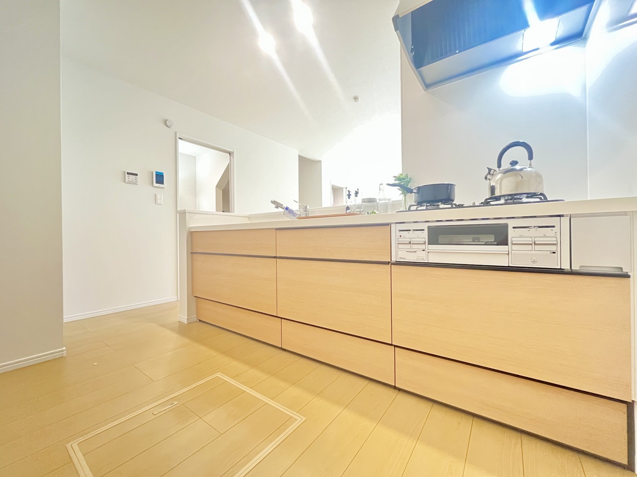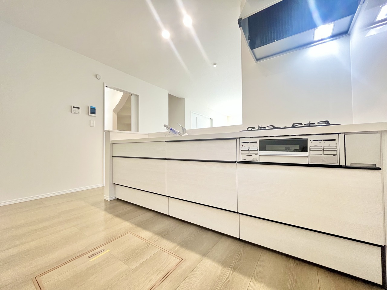 A号棟 リビングにいる家族の顔が見渡せるカウンターキッチン。お料理もより一層おいしく、楽しく。食器棚を背面に設置しても十分な広さを確保しています。 2025/12/26m