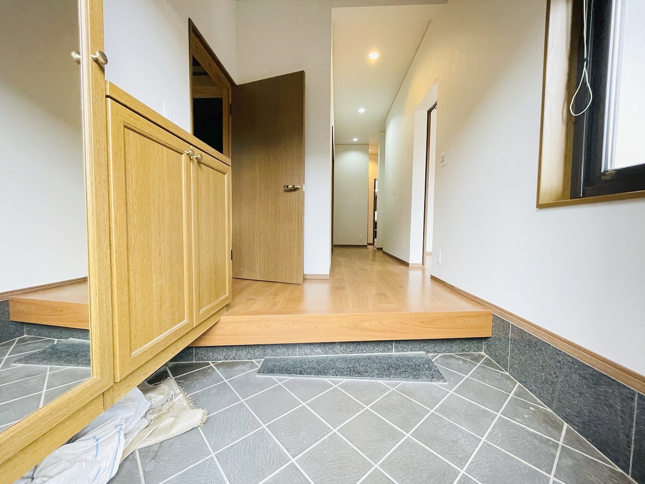 玄関は家の第一印象を左右する重要な場所。ほどよい広さとスタイリッシュな色遣いが印象的です。