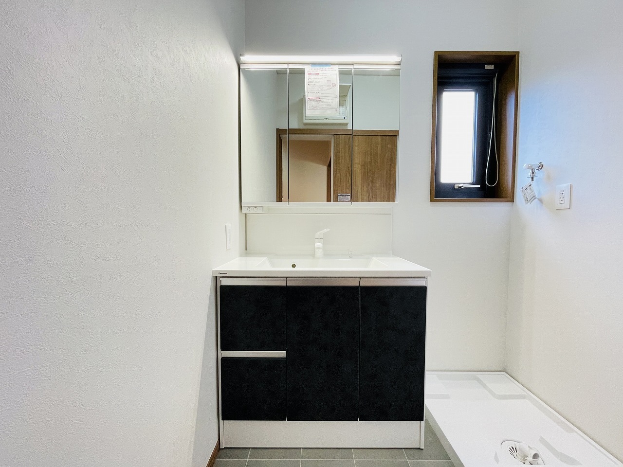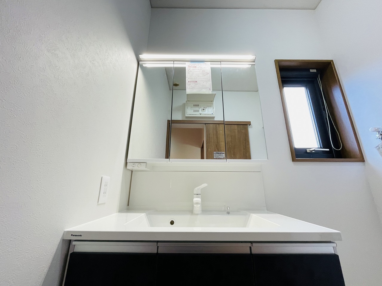 三面鏡に洗面台。 コンセントに照明機能、多機能性を備えた設備です。