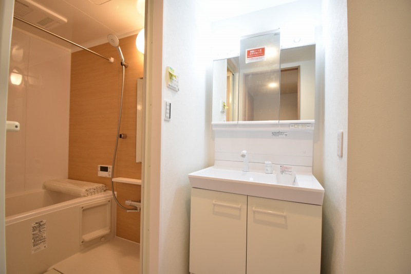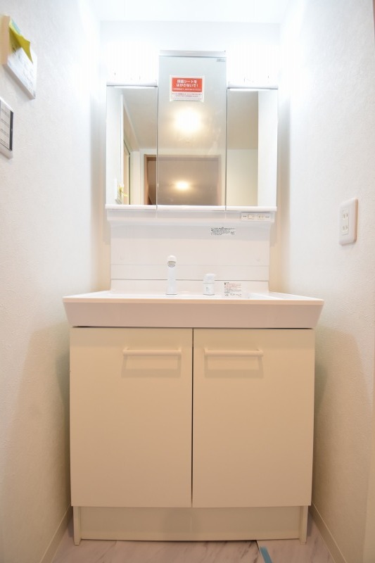 三面鏡に洗面台。 コンセントに照明機能、多機能性を備えた設備です。