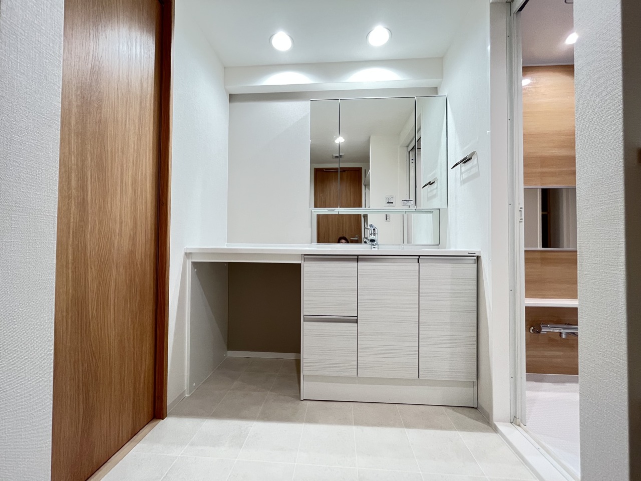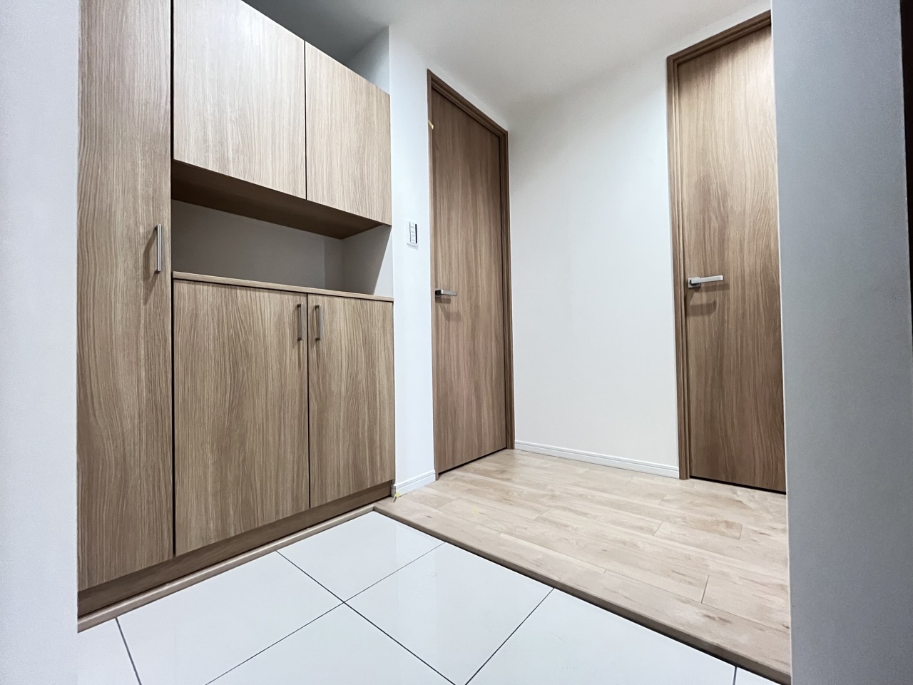 木の温もりを感じさせる扉の隣に広がる、清潔感あふれる空間。計算された配置と洗練されたデザインが、毎日の暮らしに心地よいリズムをもたらします