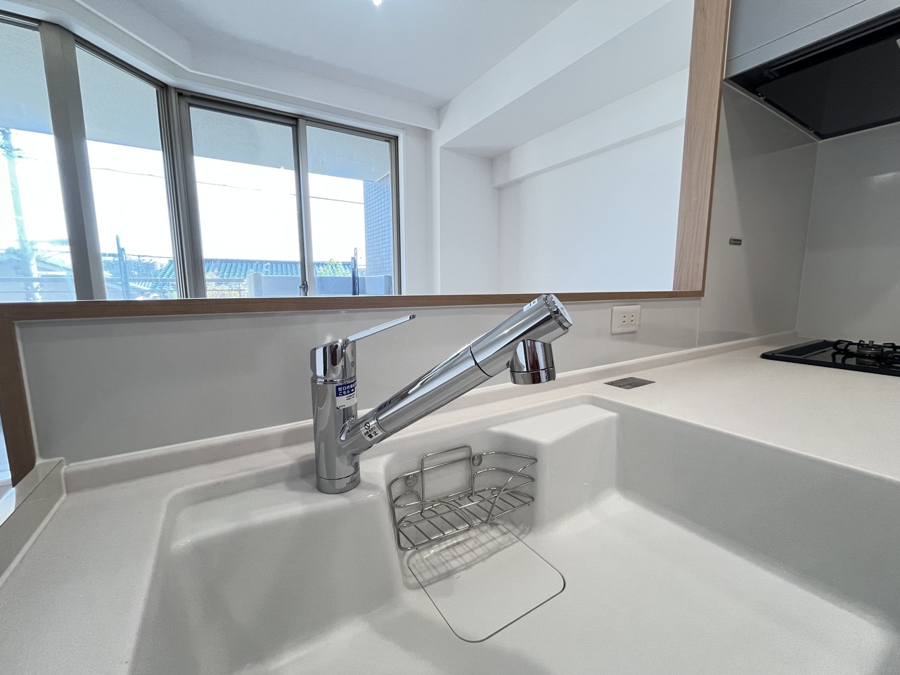 人工大理石を使用したシステムキッチン。永く傷つきにくく、お手入れもしやすい高機能性です。