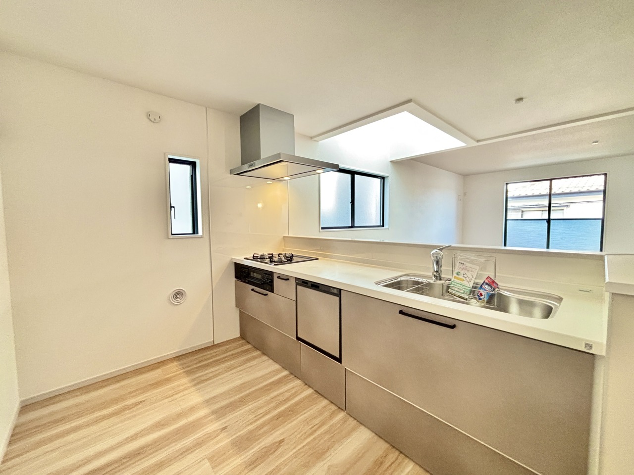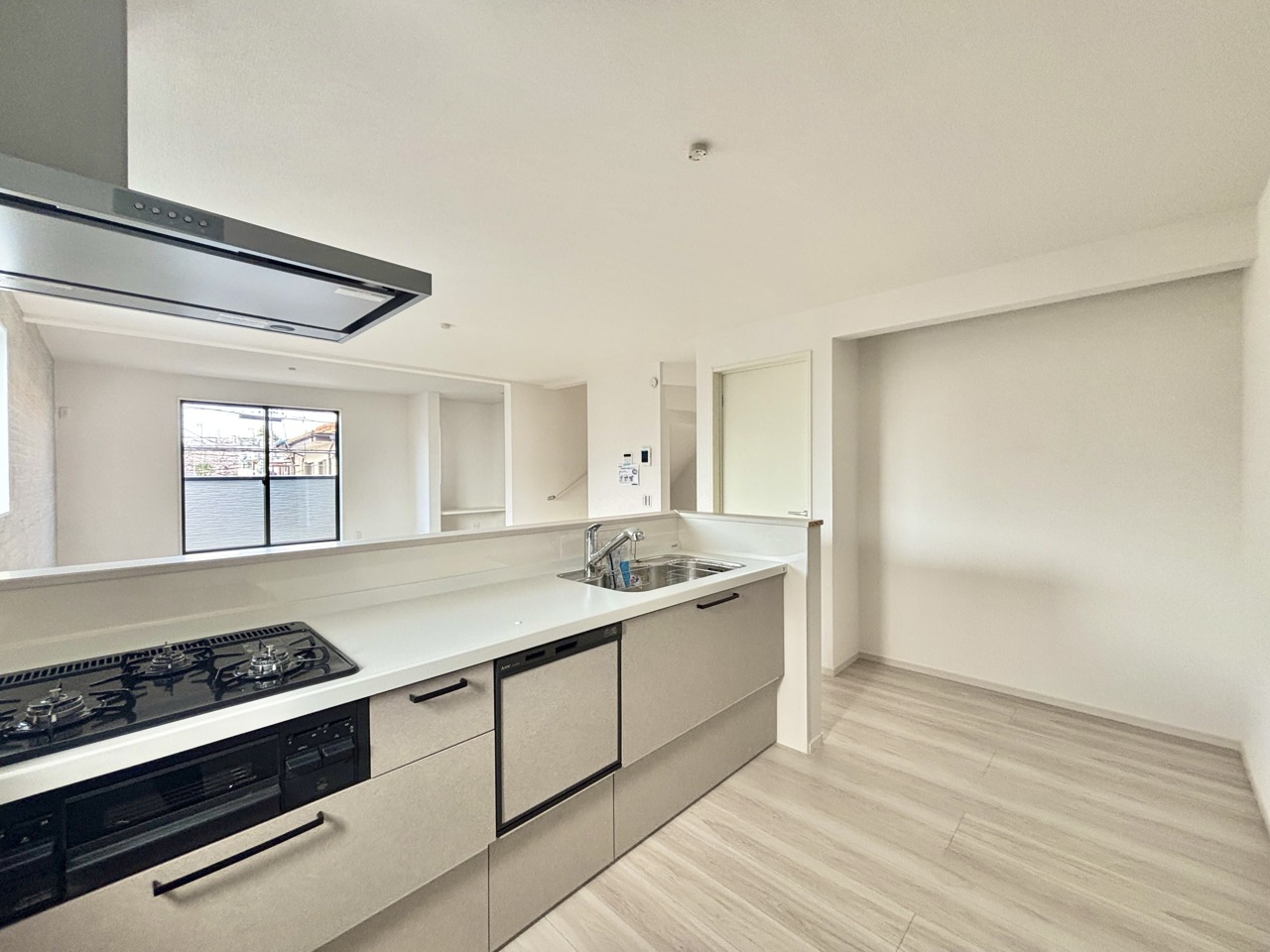 1号棟 キッチンはオープンカフェスタイルだからリビングとの一体感はバッチリ。毎日のお料理時間も楽しくなりそうです。 2026/03/28m