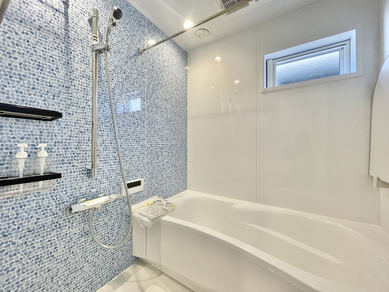 清潔感あふれる青いタイルが印象的な、心地よいバスタイムを演出する空間。