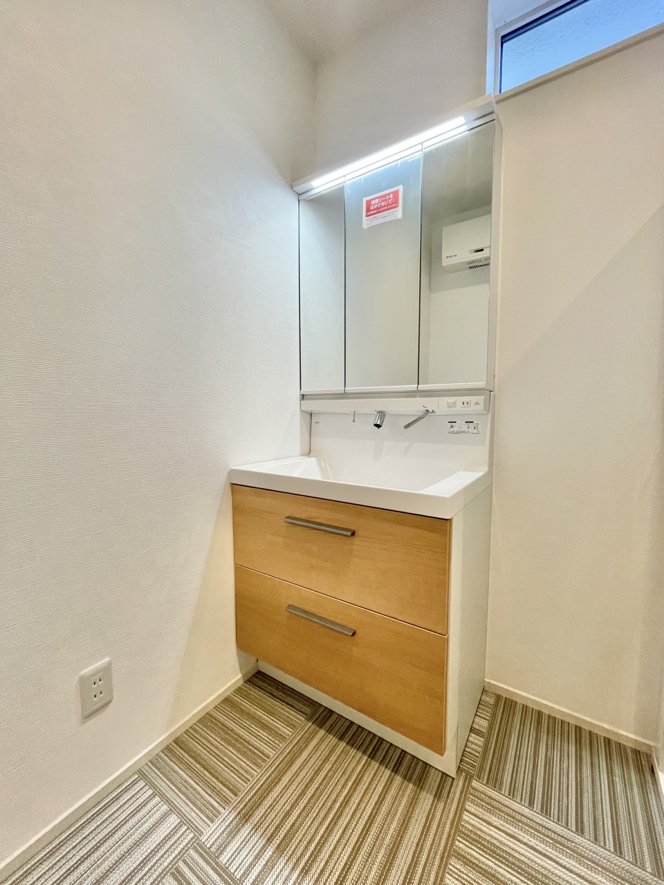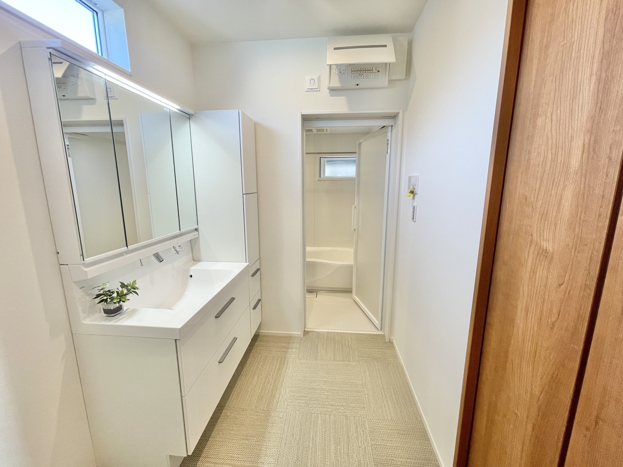 清潔感あふれる空間に、温かみのある木目調が調和する洗面スペース。