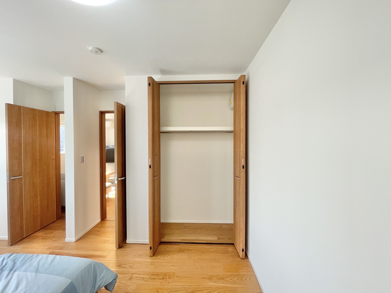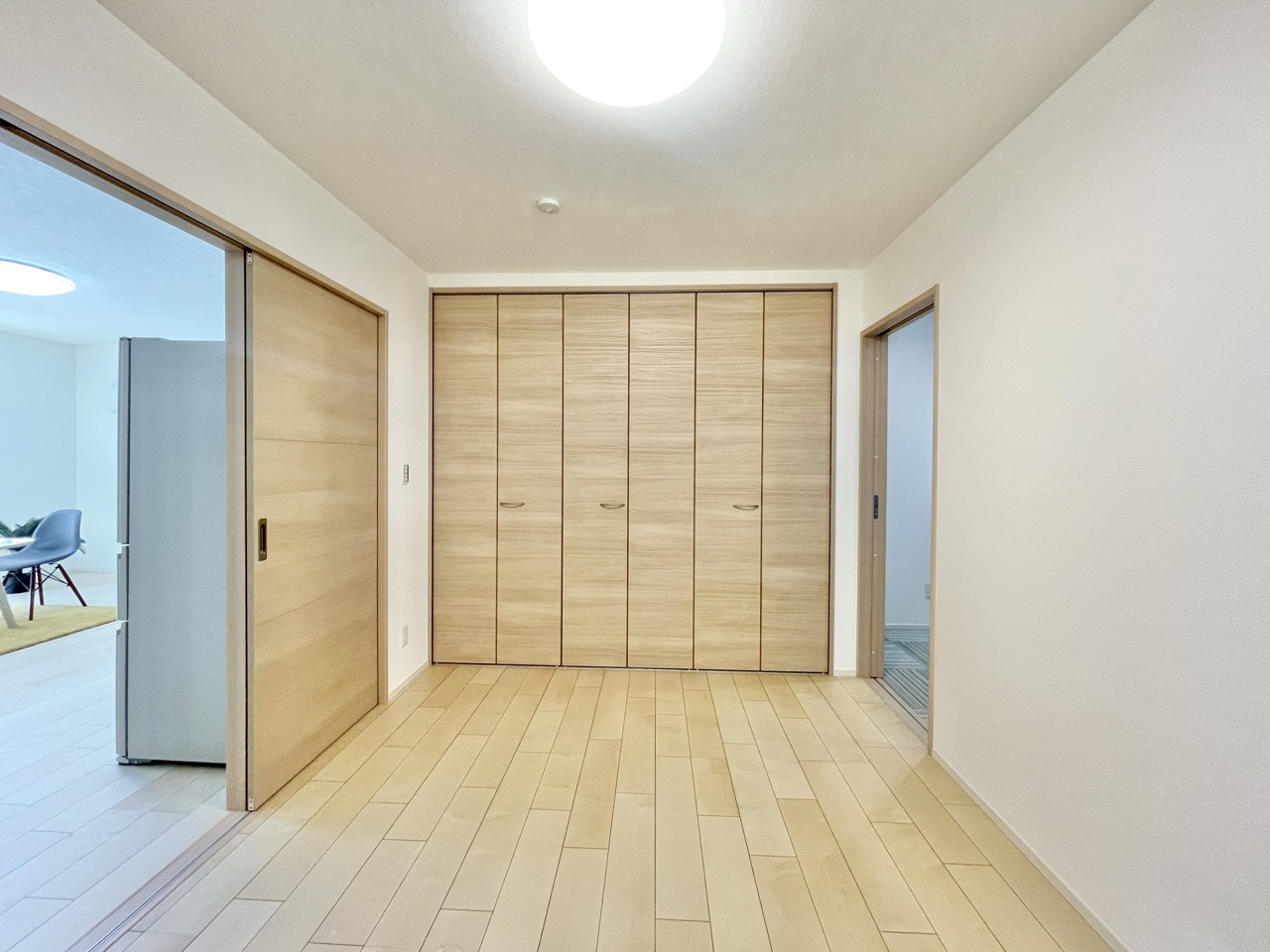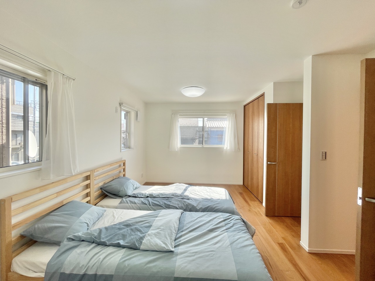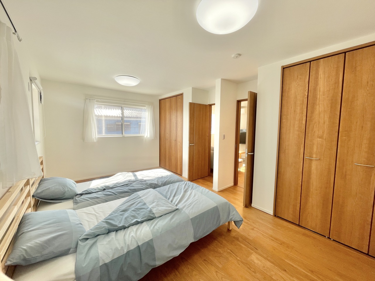 この部屋だれの部屋にしようかな、なんて会話を現地で楽しんでください。 木の温もりと白壁が調和する、心地よい空間