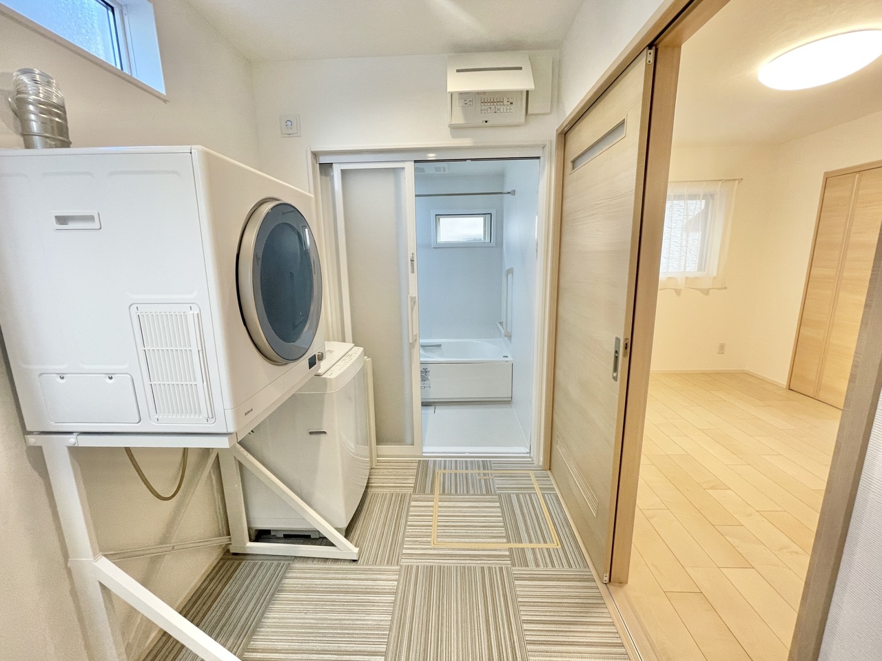 清潔感あふれる空間に、柔らかな印象の床材が調和する設え。
