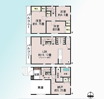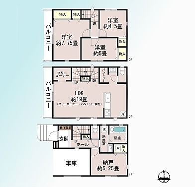 | 間取 | 3SLDK~3SLDK (S5.25帖、LDK19帖、洋室7.75帖、洋室5帖、洋室4.5帖) | ||