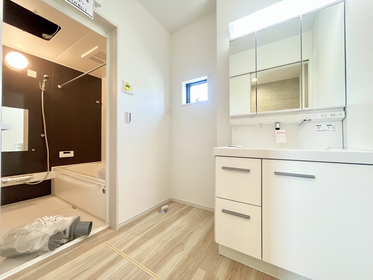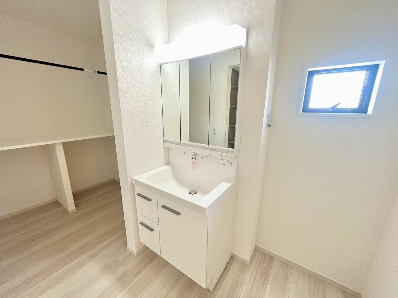 1号棟 使い勝手の良い洗面台、窓があることで換気もしやすく清潔感のある空間を保てます。 2026/04/18m