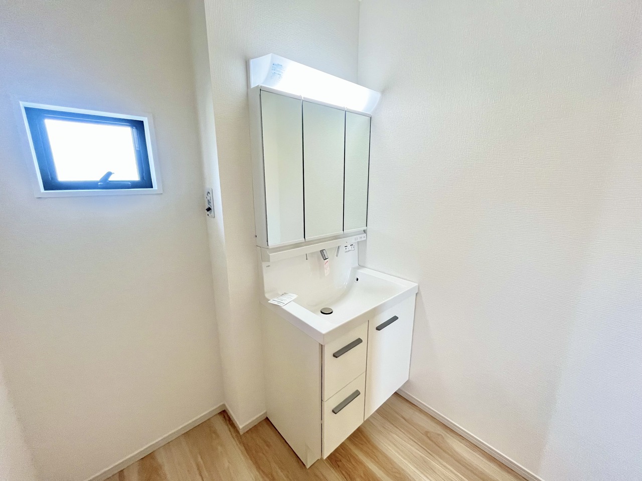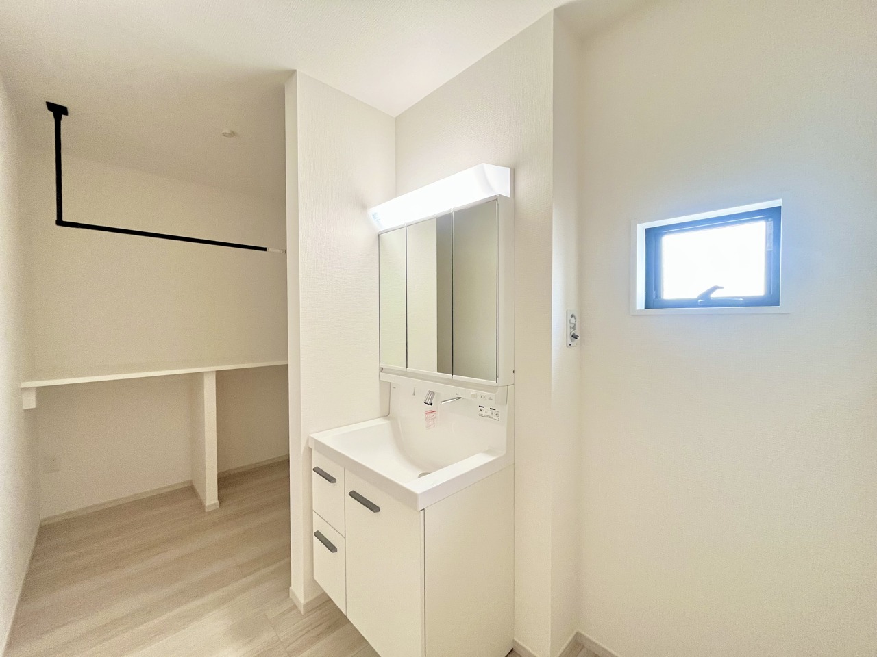 2号棟 使い勝手の良い洗面台、窓があることで換気もしやすく清潔感のある空間を保てます。 2026/04/18m