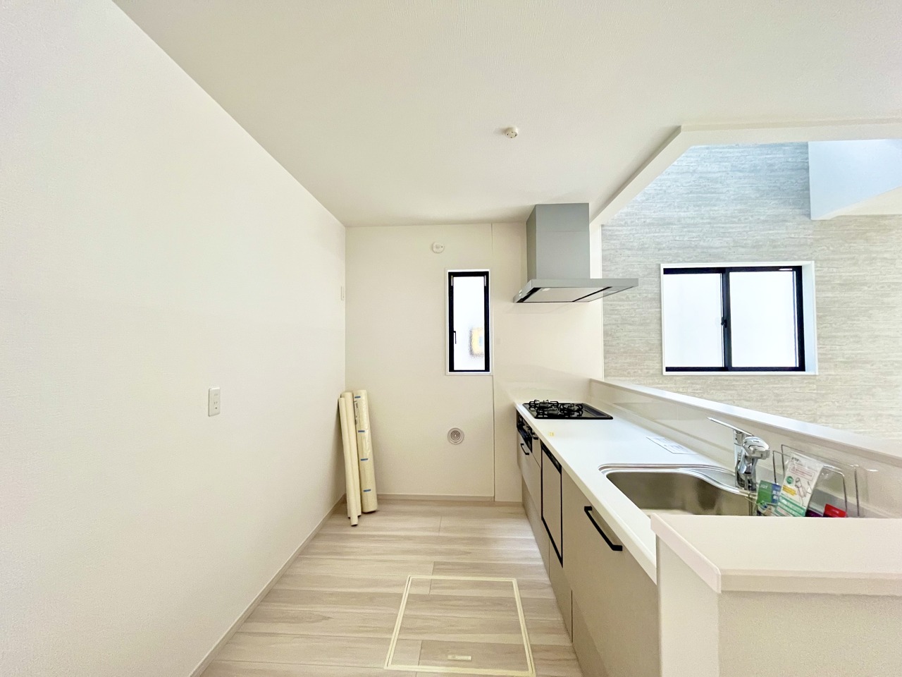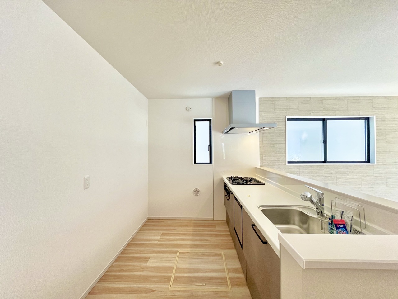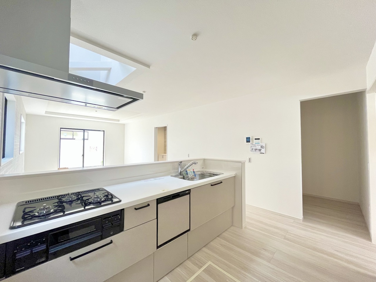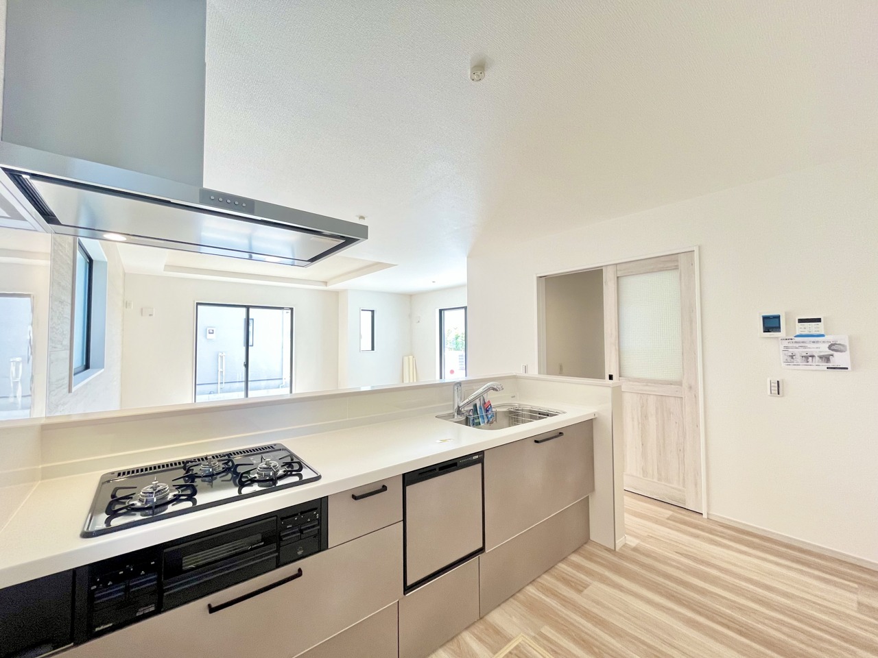2号棟 リビングにいる家族の顔が見渡せるカウンターキッチン。お料理もより一層おいしく、楽しく。食器棚を背面に設置しても十分な広さを確保しています。 2026/04/18m