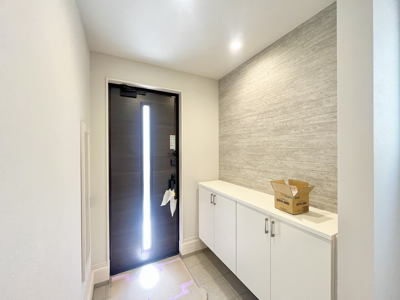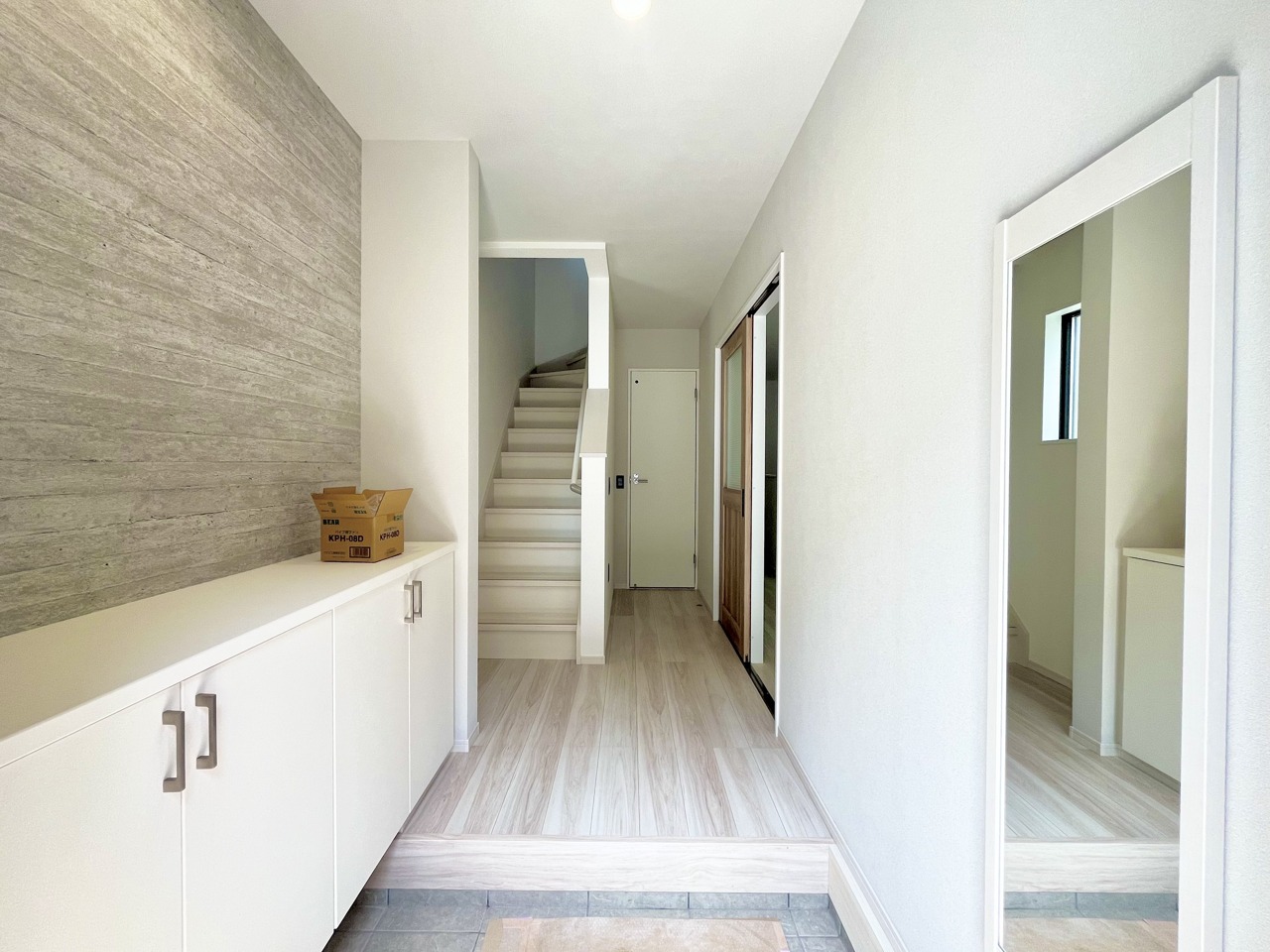 2号棟 お宅の顔となる明るく開放的な玄関。ご家族皆様様の靴を収納できるスペースと全身鏡があり、お出掛け前に身だしなみチェックもできます。 2026/04/18m