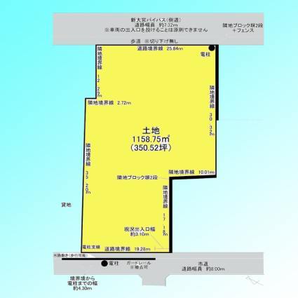 | 備考・制限等 | 敷地の南西側を水路(水路敷き)に接しているため、戸田市役所に対して河川占有許可申請が必要となり、敷地の用途によって水路敷の蓋の改良が必要です(買主負担) 敷地の南西側と道路の間にはガードレールがありますが、敷地の用途によりガードレールの撤去の可否及び撤去できる範囲が異なります。 北東側の道路(新大宮バイパス)に出入口を設けることは原則としてできません。(関係行政機関と要相) 南西側の角付近にある電柱の支線は、敷地外への移設は不可となります。 |